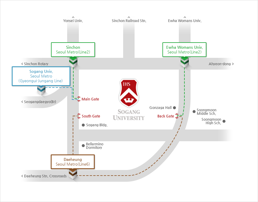 | By Subway | To get to Sogang, take the subway Line no. 9 from Gimpo International Airport Station and transfer to the Green Line no. 2 at Dangsan Station, and finally, get off at ‘SINCHON’ (stop #240), get out Exit no. 6 and you can arrive at main entrance within 8 minutes on foot. Or take the Line no. 6 and get off at ‘DAEHEUNG’ (stop #625), get out Exit no. 1 and you can reach the south entrance within 12 minutes on foot. The basic fare starts at 1,000 won (about USD 1) and increases according to distance. Most announcement signs are in Korean, English and Chinese. For Further Information, |